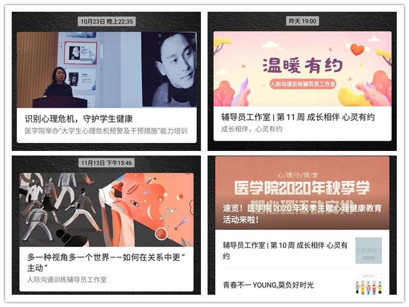 还先后邀请了多位心理咨询师提供“一对一”的个案心理咨询、团辅项目指导,联系关工委老同志参与学生成长对话,安排辅导员进行“青春有约”交流。9月至11月,美国纽约州注册心理咨询师徐静雯、国家二级心理咨询师奚晓岚、刘杏芝分别应邀为学生带来了《超越舒适区:爱上不完美的自己》《学生心理危机预警及干预措施》等多场心理主题讲座,庄濛杰、蒋武、沈力晔等多位专业心理咨询师分别组织和指导开展了多场心理团辅活动,并每周定期为医学生提供专业心理咨询。各种专业的心理支持与帮助得到了91制片