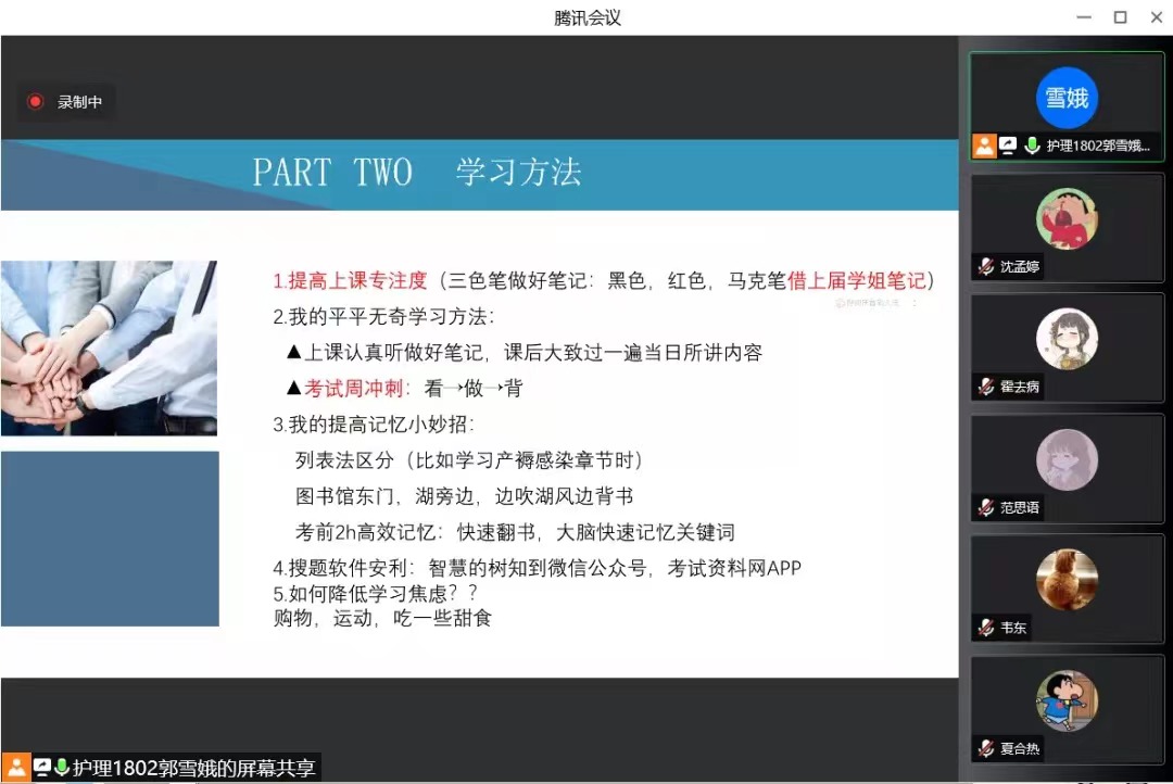 补习“小课堂”,精准帮扶效果实。线下不能聚集,线上“小课堂”正如火如荼地开展。学院精心组织补习“小课堂”,以直播会议的形式,邀请高年级同学补充讲解课堂上的学习要点。来自护理1802班的郭雪娥同学为同学们分析了妇科护理学学习的难点与要点,针对学习的不同阶段,详细提供了不同的复习方法。其他“小老师”还就获取学习资料、缓解学习压力等方面做出了详细讲解,与会同学纷纷表示“干货满满”,“又get了一个新的学习技能”。