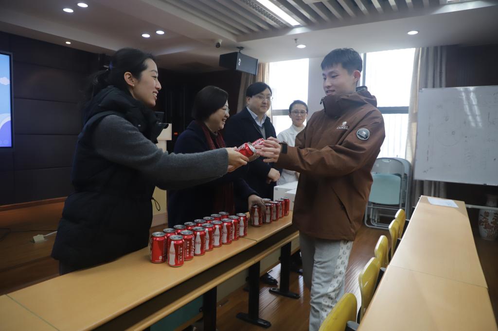 钱燕华表达了对考研同学的深切关怀。她表示,希望这些印有每位毕业生姓名的可乐能够记录下同学们人生中非常重要的拼搏时刻。同时她指出,考研之路虽充满挑战和困难,却也是一次磨炼和成长的机会。她悉心叮嘱同学们调整好状态,合理安排复习时间,做到全力以赴、张弛有度,充分利用好最后的复习时间,固强补弱,查漏补缺。