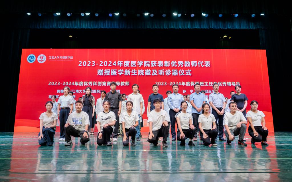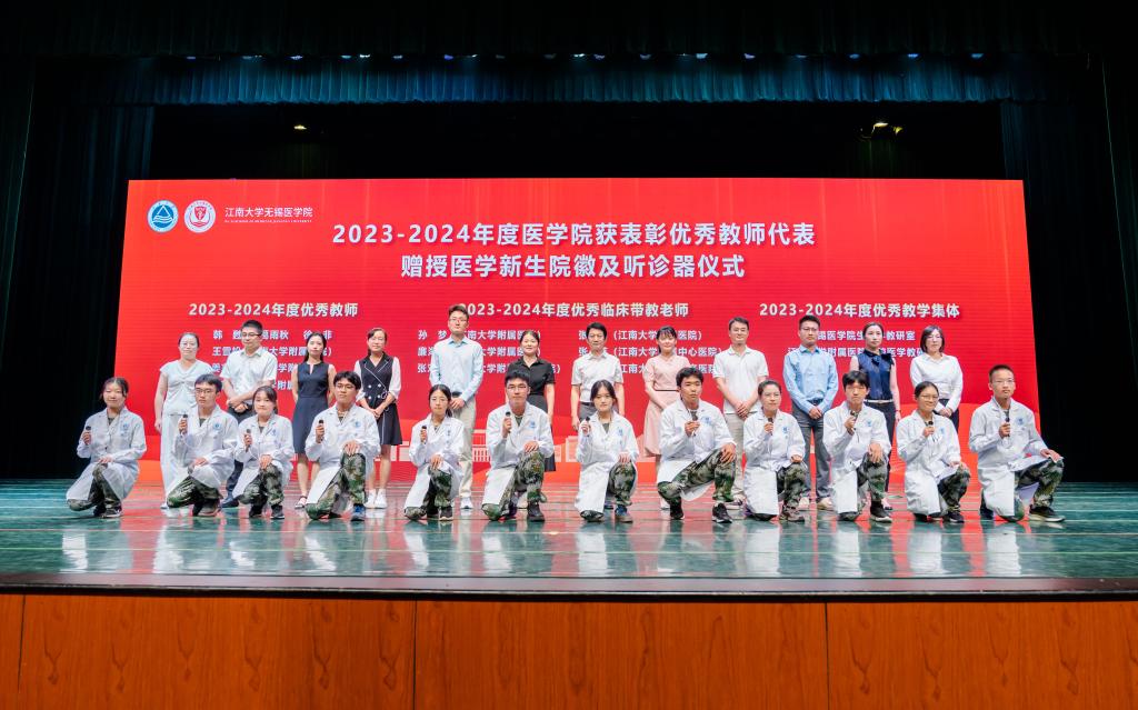 优秀教师、优秀临床带教老师、优秀教学集体、优秀科创指导教师、优秀班主任、优秀辅导员代表共同为本科生、研究生新生代表佩戴“江南医学人”院徽、授予听诊器。