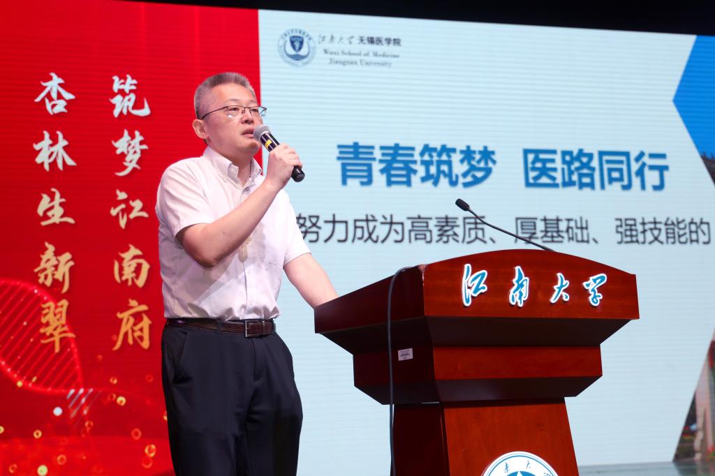 笪学荣致辞欢迎全体医学新生们的到来,他首先向同学们介绍了无锡的经济建设、历史文化、人文底蕴等方面情况,并详细讲述了无锡卫生健康事业的发展情况,他强调在市校共建机制保障下医学教育与医学人才培养取得新发展,已实现无锡本地医学本-硕-博一体化人才培养通道,他寄语91制片