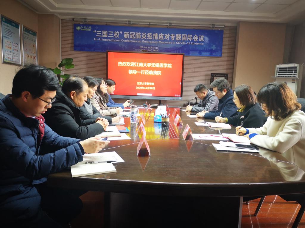、附属医院在教学任务的分配和实施、研究生教育和管理体系、导师聘任和管理等方面分享经验;江苏大学一附院院长陈德玉介绍了医院的总体情况,医院常委常务副书记、副院长王祥、副院长袁国跃以及医院相关科室负责人围绕附属医院与学校的融合、教学机构设置、临床师资培养、学生带教管理等工作进行了广泛交流。