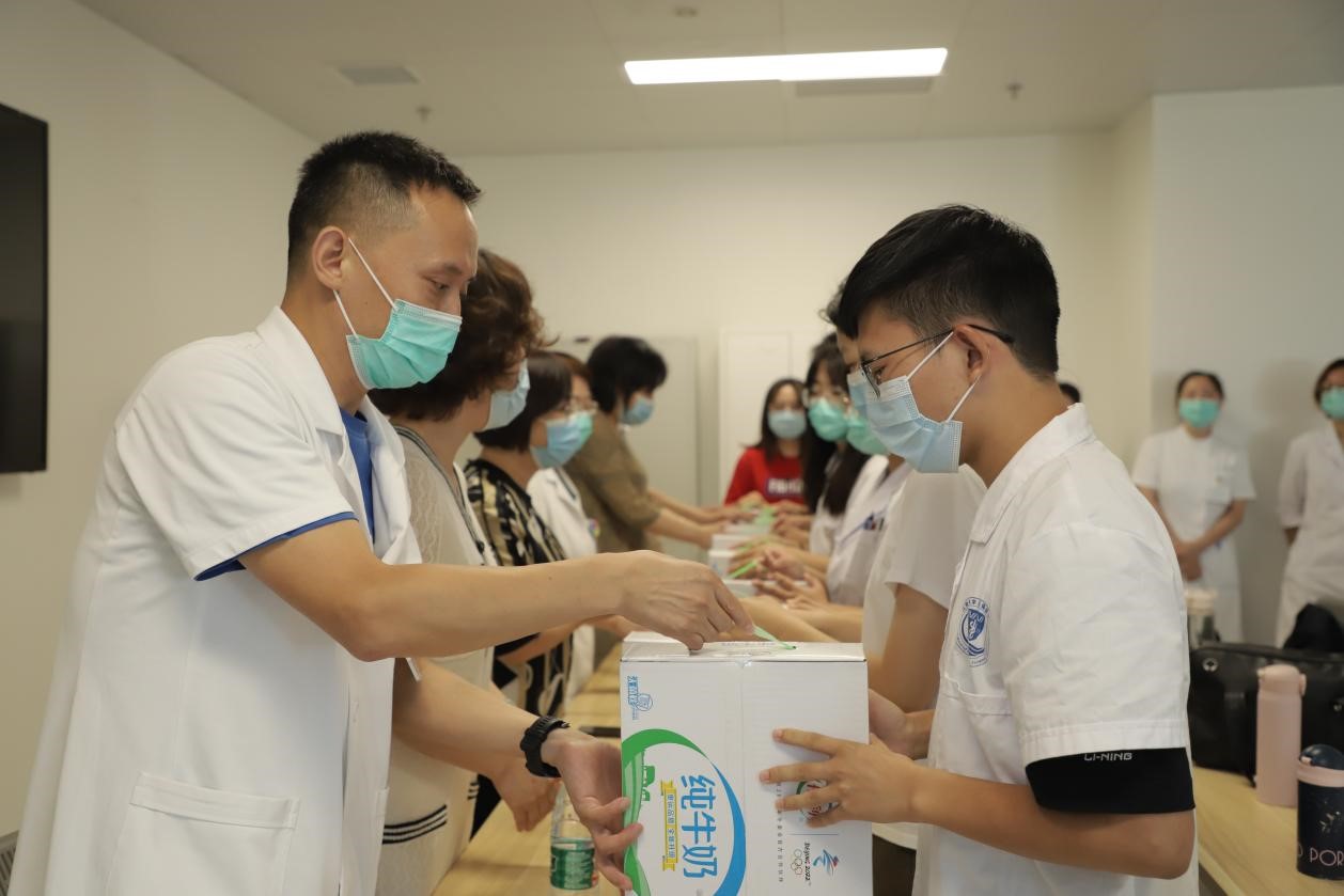 党委书记向琪,党委副书记、副院长奚晓岚,以及班主任、辅导员老师们来到附属医院,看望与慰问暑假在岗师生,并与相关科室的带教老师和同学们进行了座谈交流,了解初入实习的同学们的实习、生活情况,聆听师生们的心声,并送上鲜花、牛奶等慰问品,鼓励同学们积极认真参与临床实习、注意疫情防控和暑期安全。