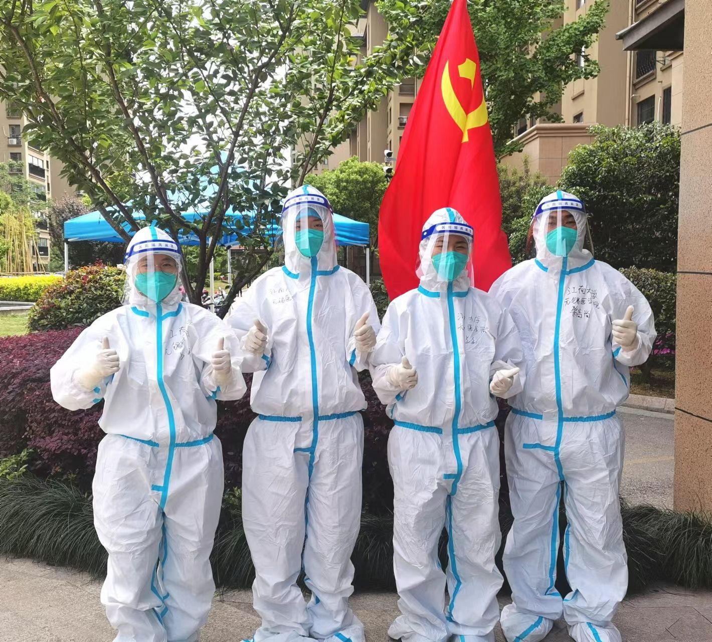 抗疫采样队员不辱使命,连续作战,当天来回往返,多次凌晨3、4点起床,足迹从张家港走向昆山,涉及10个镇、27个社区。队员们每日穿着闷热不透气的防护服、戴着勒得非常紧的口罩,不惧炎热,无畏风雨,每天平均采样时间是6小时,承担着高强度的核酸检测任务和心理压力,女教师还需克服身体应激反应、生理期等各种不适。采样期间,队员们曾合力抢救晕厥女孩,被当地群众称为最美大学老师;他们也因采样手法比较柔和,说话比较温柔,被当地社区人员夸赞与其他“大白”有点“不一样”,得到了当地群众的一致认可。虽然采样期间很多队员出现了脱水症状,因长期闷在面罩和口罩里身体出现了外伤;虽然经常饿到下午2点钟还没吃饭,有时拿方便面充饥,甚至找不到一处可以坐下来吃饭的地方;虽然家里还有嗷嗷待哺的幼儿在哭着找妈妈,还有老人需要照顾,但是来自学校的关怀让他们勇往直前,家里的支持成为他们拼搏的“铠甲”。此刻他们不仅仅是师者,还是医者,他们用自己的行动诠释了医者的使命担当,用自己的行动为学生树立了榜样。他们也因敢吃苦、能战斗,团结一致、听从指挥,各方面表现突出受到了省卫健委张金宏副主任和人事处李博处长的表扬和肯定。