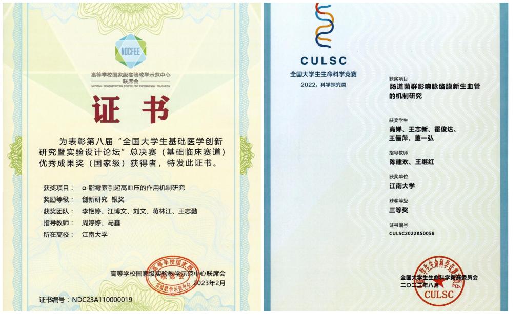 本科生获全国大学生基础医学创新论坛暨实验设计大赛二等奖2项、三等奖3项;全国大学生生命科学竞赛三等奖3项;江苏省“互联网+”大学生创新创业大赛一等奖1项、三等奖1项;“创青春”江苏省大学生创业大赛银奖1项;中国大学生医学技术技能大赛华东赛区二等奖1项、三等奖2项、单项奖2项;全国大学生基础医学创新研究暨实验设计论坛东部赛区二等奖1项、三等奖2项;全国大学生生命科学竞赛江苏赛区二等奖2项、三等奖1项。