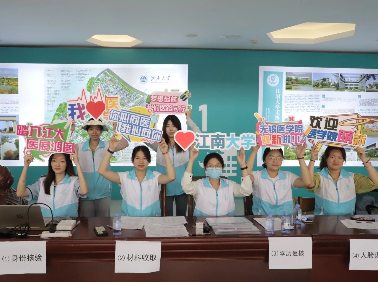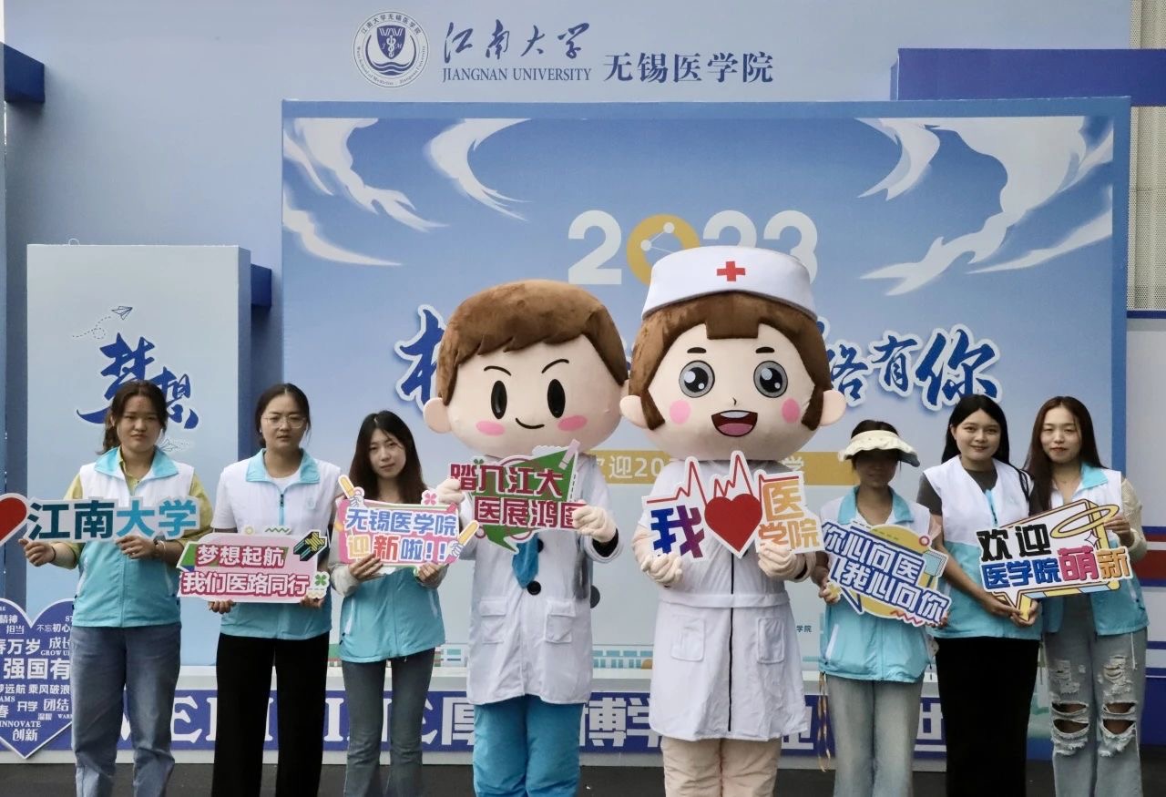 为了确保新生报到工作的顺利开展,老师和学生志愿者们做足了准备工作。他们搭建迎新摊位、调试迎新系统、准备迎新道具,培训院情学情宣讲志愿者。在学院门口放置有以“相约江南,医路有你”医护急救为主题的迎新喷绘展板,人脸镂空的男女医师喷绘设计可供新生打卡拍照。学院地面上铺设的医学特色地贴指导新生们每一步的报到流程,学院大厅的江南医学学科展示让新生们第一次了解江南、第一眼爱上江南、第一回即信任江南!一切的一切只为给新同学们留下值得回味的入学体验。