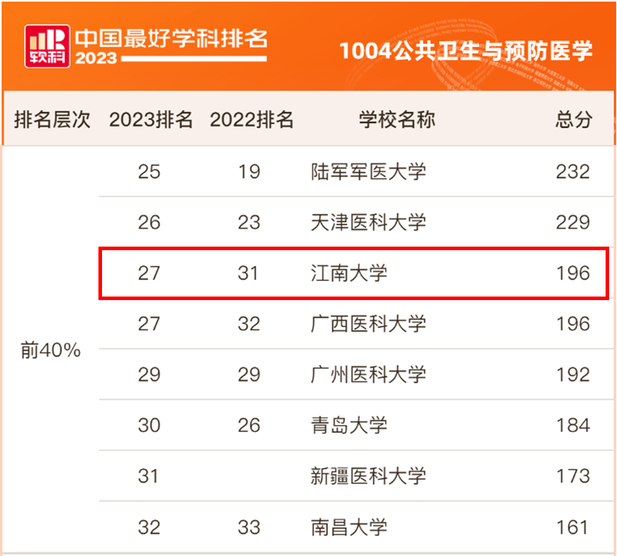 2023年11月8日,高等教育评价专业机构软科正式发布“2023软科中国最好学科排名”。排名指标体系由人才培养、平台项目、成果获奖、学术论文、高端人才5个类别组成,下设18个指标,包括70余项测量变量。在“2023软科中国最好学科排名”——公共卫生与预防医学学科排名中,全国共入围91制片