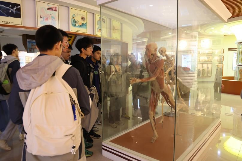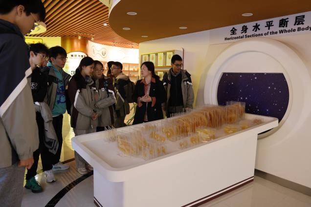 教师徐白为来访师生展示了人体组成、人体标本制作方法等医学专业知识和技术,并详细讲解了“危险三角区”等展品背后的医学原理,激发来访学子对人体奥秘探索及医学职业的兴趣,引领同学们珍惜生命、爱护生命、尊重生命、敬畏生命。