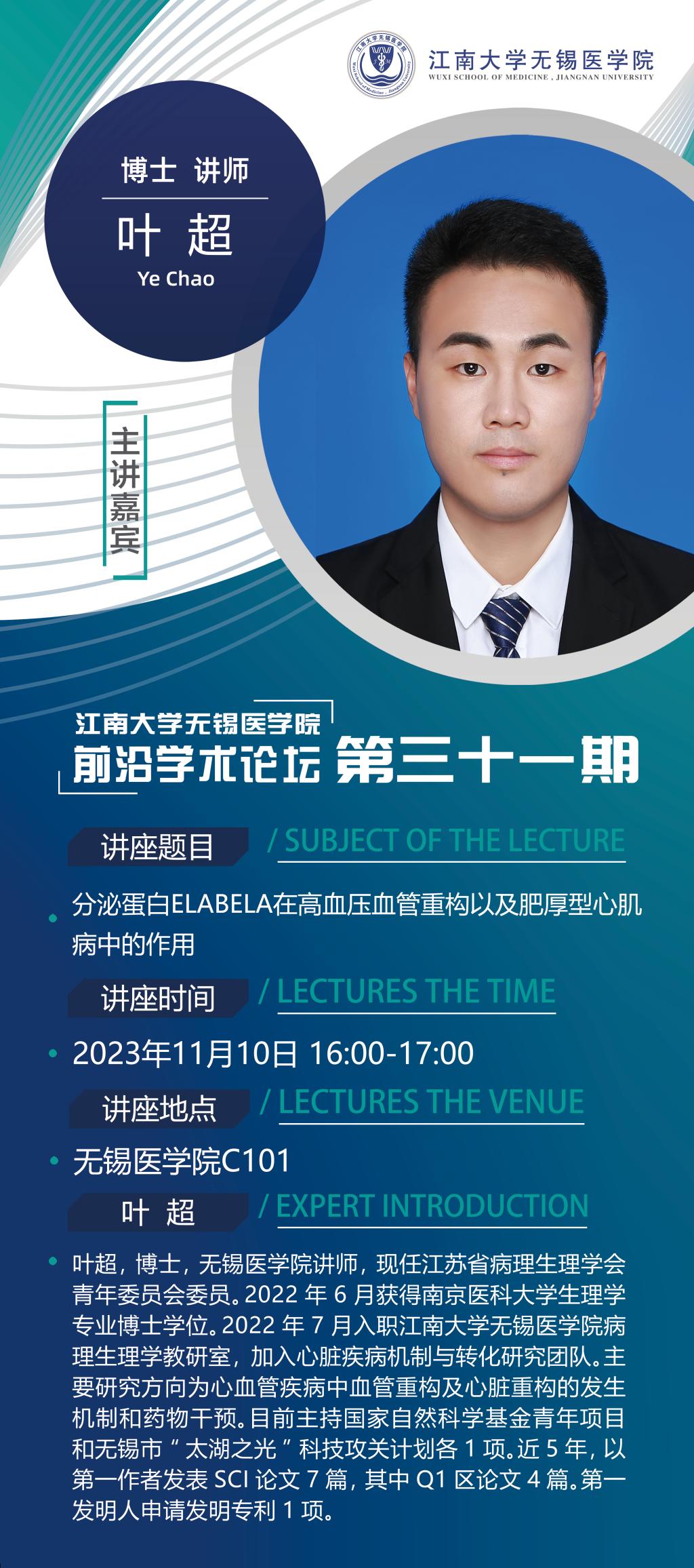 11月10日91制片 前沿学术论坛第三十一讲 叶超老师——分泌蛋白ELABELA在高血压血管重构以及肥厚型心肌病中的作用