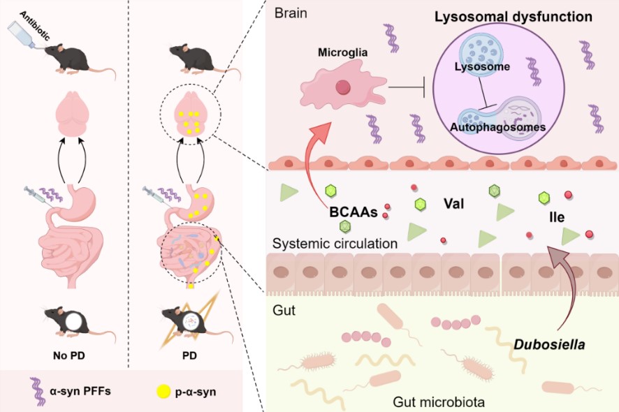 申延琴教授《Brain Behavior and Immunity》发表了题为“Gut microbiota promote the propagation of pathologic α-syn from gut to brain in gut-originated Parkinson's disease model of mice”的研究性论文。肠道菌群和α-syn传播被证实是帕金森病发展的关键因素,虽然肠道是α-syn病理的起源之一,但肠道菌群如何调控肠起源α-syn病理发展并不明确。该研究首次揭示了肠道菌群在肠起源帕金森病中的动态变化规律,首次证实肠道菌群(尤其是Dubosiella)是推动α-syn病理从肠到脑传播的关键因素,其通过BCAA代谢紊乱导致溶酶体功能障碍,最终加剧α-syn聚集。这一发现为PD的早期干预提供了新靶点:调控肠道菌群或靶向BCAA代谢可能成为延缓PD进展的有效策略。