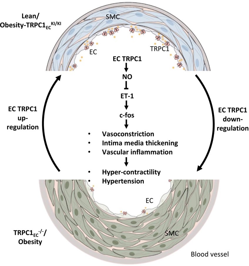 该项研究表明,内皮TRPC1是生理性和病理性肥胖状态下血管功能变化和血压的一个调节因子,且其与c-Fos信号传导相关。内皮TRPC1的缺失通过增加炎症调节因子c-Fos水平导致内皮功能受损和血压升高,反之亦然。本研究提供了一种在病理性肥胖条件下通过靶向内皮TRPC1来改善血管功能的策略。