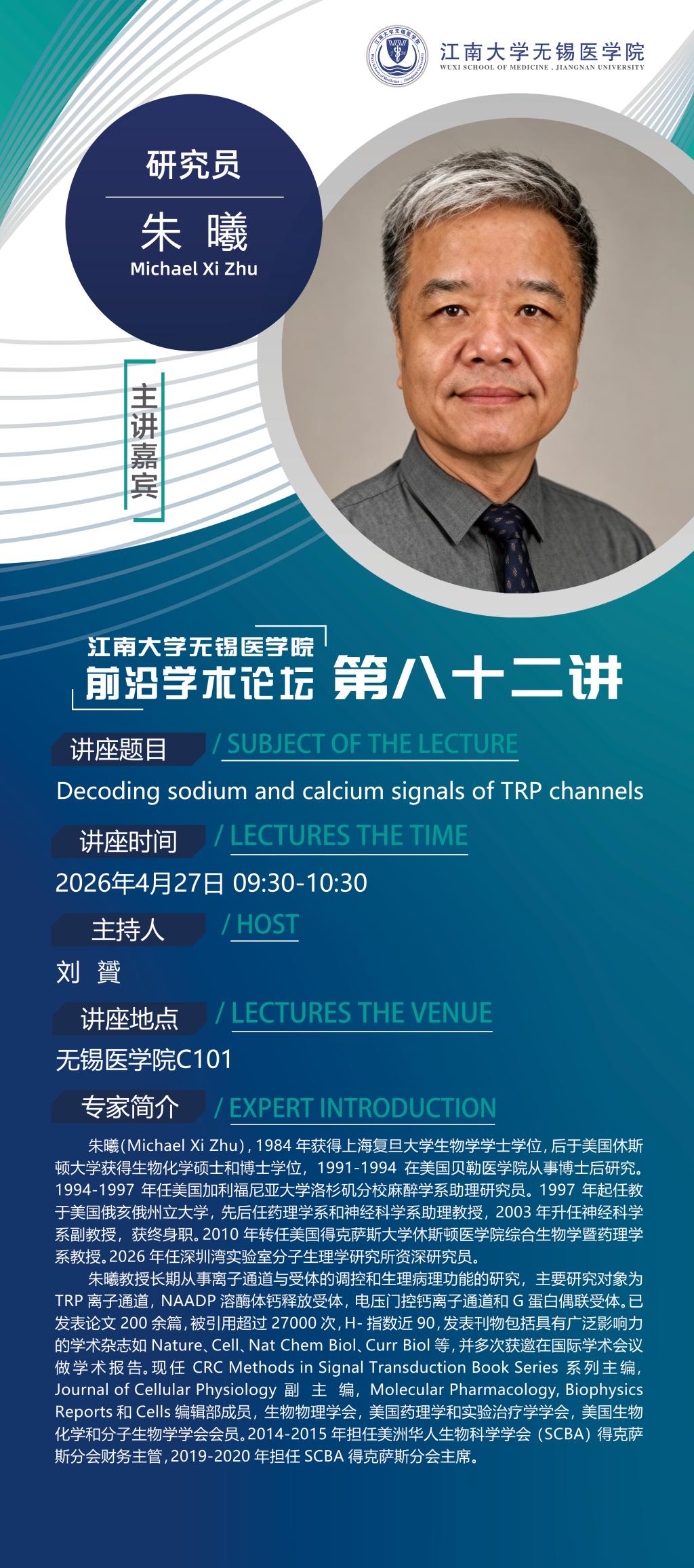朱曦教授长期从事离子通道与受体的调控和生理病理功能的研究,主要研究对象为TRP离子通道,NAADP溶酶体钙释放受体,电压门控钙离子通道和G蛋白偶联受体。已发表论文200余篇,被引用超过27000次,H-指数近90,发表刊物包括具有广泛影响力的学术杂志如Nature、Cell、Nat Chem Biol、Curr Biol等,并多次获邀在国际学术会议做学术报告。现任CRC Methods in Signal Transduction Book Series系列主编,Journal of Cellular Physiology副主编,Molecular Pharmacology, Biophysics Reports和Cells编辑部成员,生物物理学会,美国药理学和实验治疗学学会,美国生物化学和分子生物学学会会员。2014-2015年担任美洲华人生物科学学会(SCBA)得克萨斯分会财务主管,2019-2020年担任SCBA得克萨斯分会主席。
