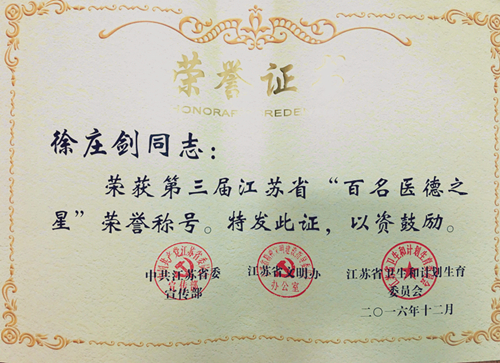 近日,根据省委宣传部、省文明办、省卫计委《关于公布第三届江苏省“十大医德标兵”、“百名医德之星”推选结果的通知》(苏卫综合[2016]14号)文件精神,附院徐庄剑获第三届江苏省“医德之星”荣誉称号。