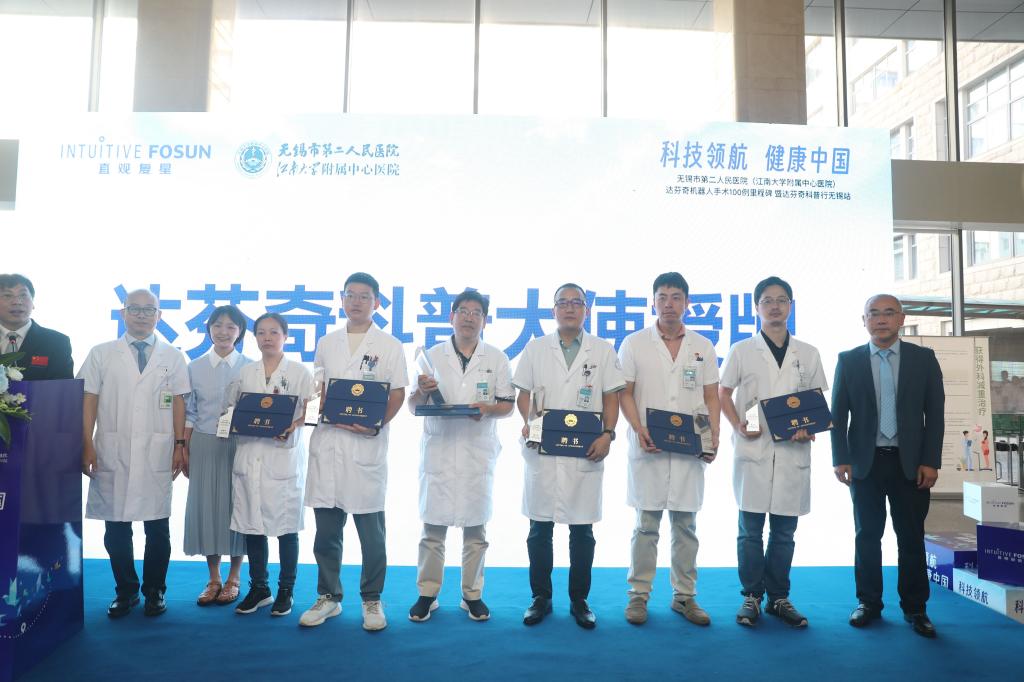副院长夏加增、瞿甦和直观复星高级市场传播经理章倩向耳鼻咽喉头颈外科赵新、泌尿外科徐新宇、泌尿外科董坚、泌尿外科吴岩、普外科陈义钢、肝胆胰外科周永平等6位达芬奇科普大使授牌。