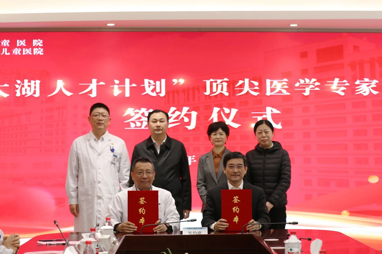 无锡市儿童医院党委副书记、院长华东与江苏省人民医院过敏诊疗中心主任程雷教授签订市“太湖人才计划”顶尖医学专家团队实施合同。