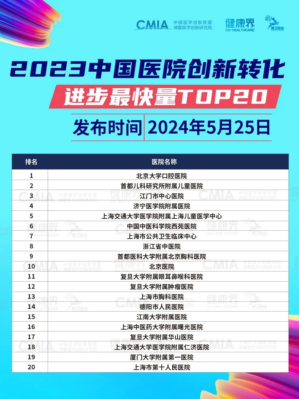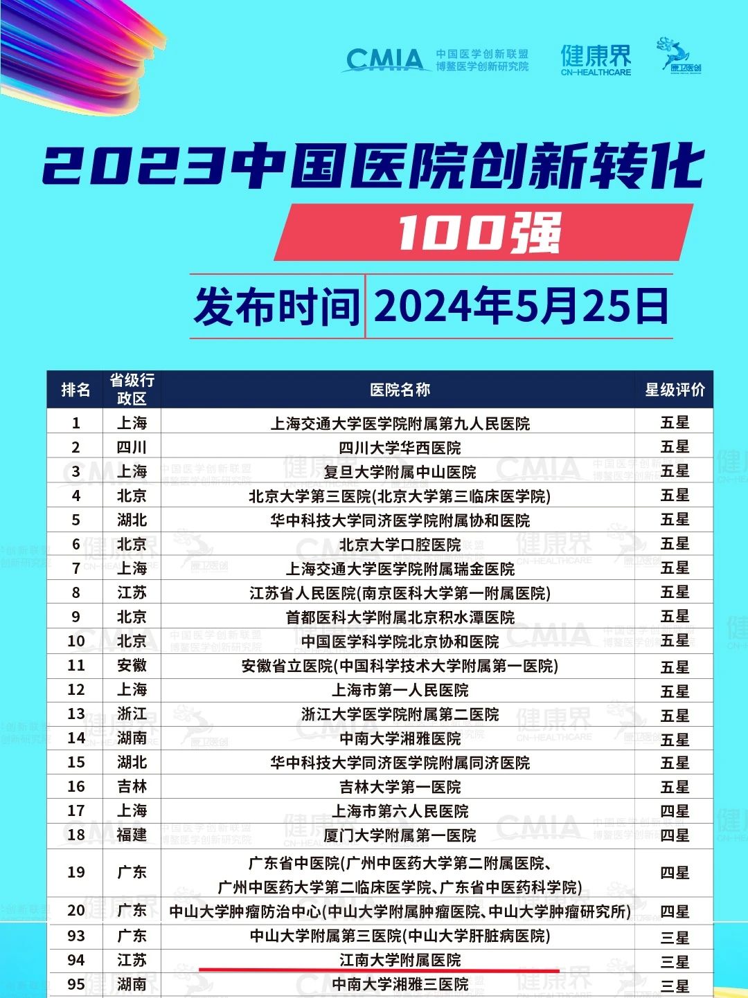 5月25日,在2024第六届CMIA医学创新大会主论坛上,备受关注的《2023中国医院创新转化100强》以及专利申请量、专利转化量等不同维度的9个评价名单正式发布。91制片