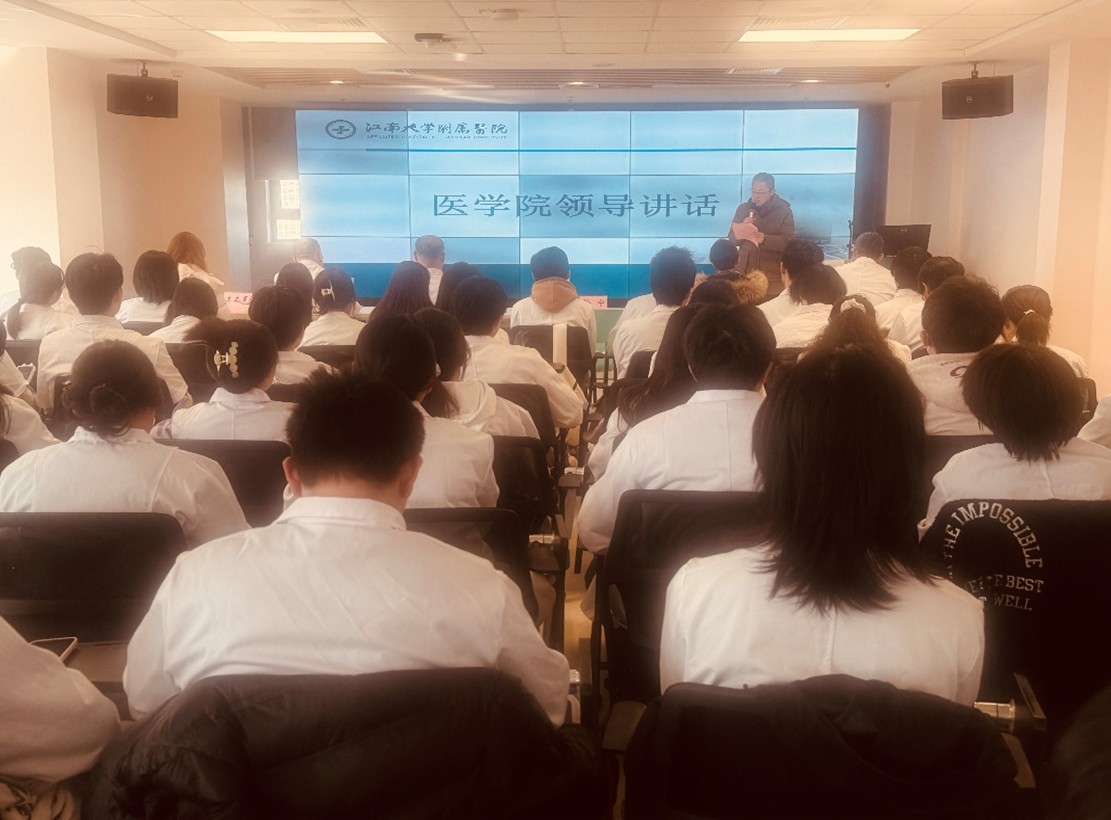 医院教育处对此次仪式给予了高度重视,精心部署。峁勇对同学们的到来表示热烈欢迎,附属医院是同学们将理论知识与临床实践深度融合的“练兵场”,是感悟医者仁心、锤炼临床思维的“大熔炉”,更是从医学生向准医生角色转变的关键起点;希望同学们能尽快融入91制片